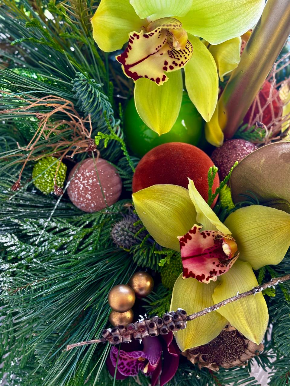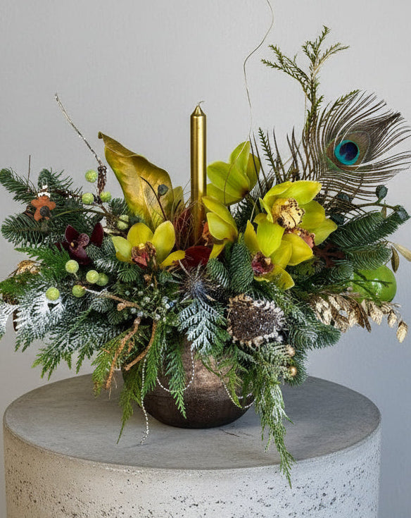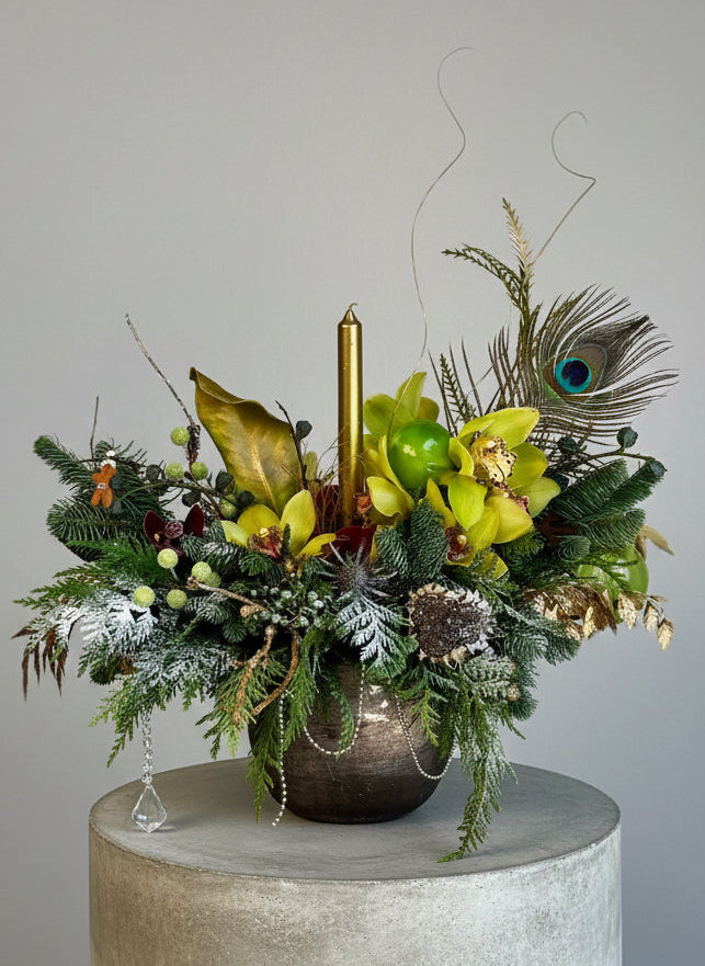 Celebre la temporada con nuestro ramo festivo, "Holiday Elegance". Las rosas rojas y blancas, que brillan como luces navideñas, se combinan con ramas de pino, creando una deliciosa combinación de belleza festiva. La refinada decoración añade encanto a este ramo, convirtiéndolo en un regalo perfecto para aportar calidez y alegría a esta mágica estación.