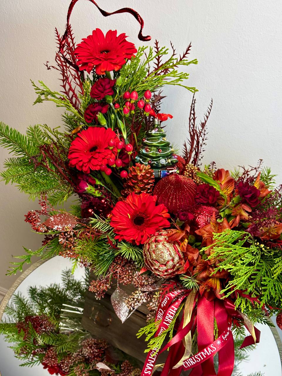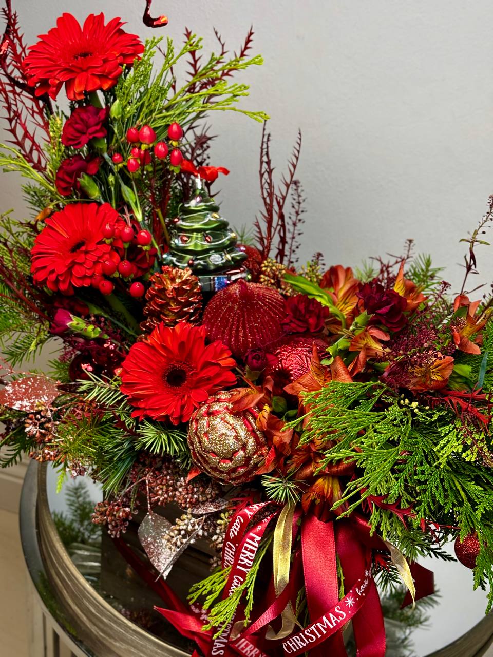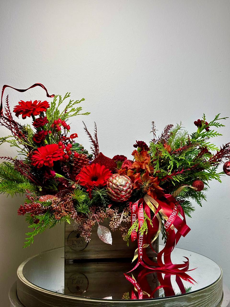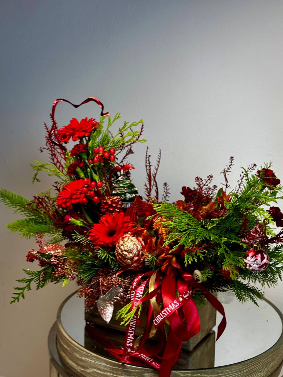 This festive arrangement features vibrant red flowers, seasonal greenery, decorative berries, pinecones, and Christmas ornaments in red and gold tones. Thoughtfully layered textures and natural elements create depth and movement, while a charming Christmas accent at the center completes the design with a cozy, woodland-inspired feel.