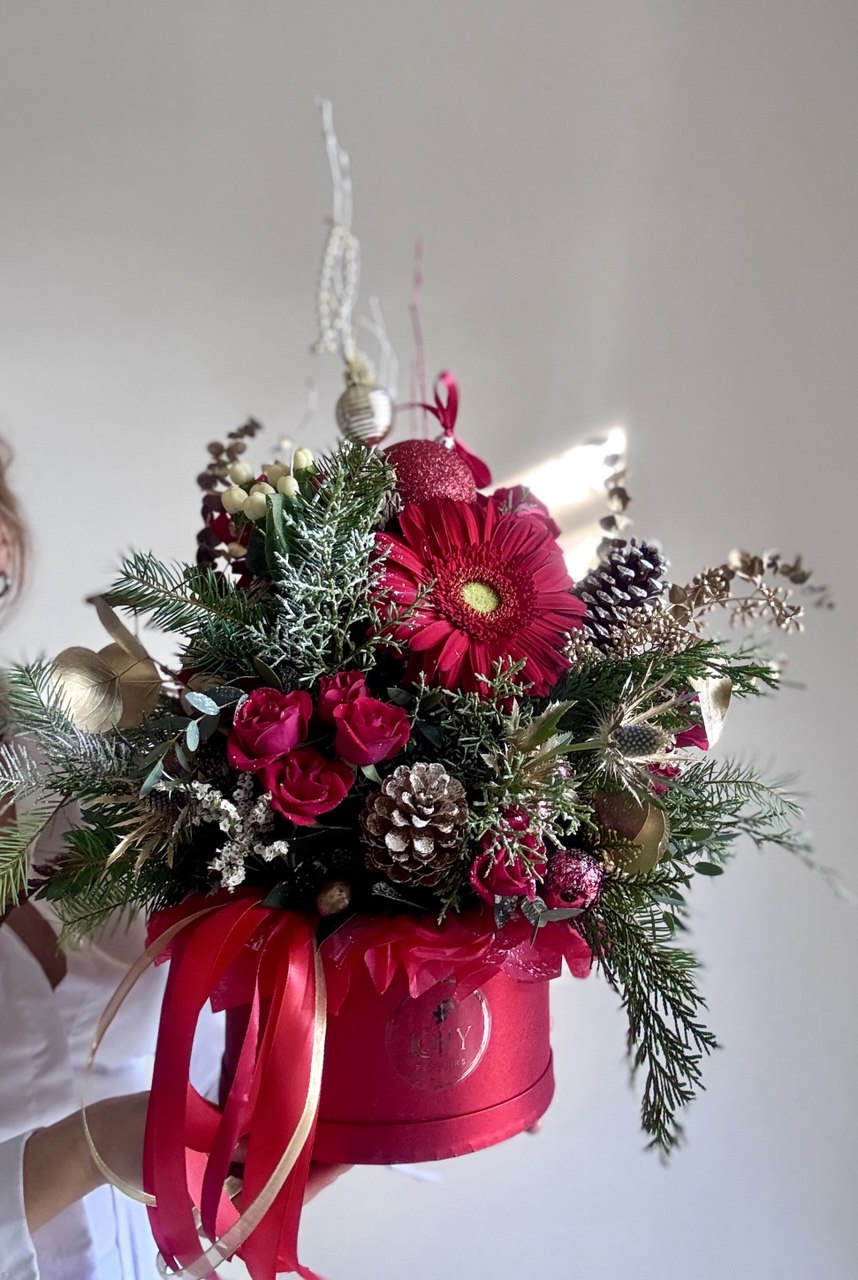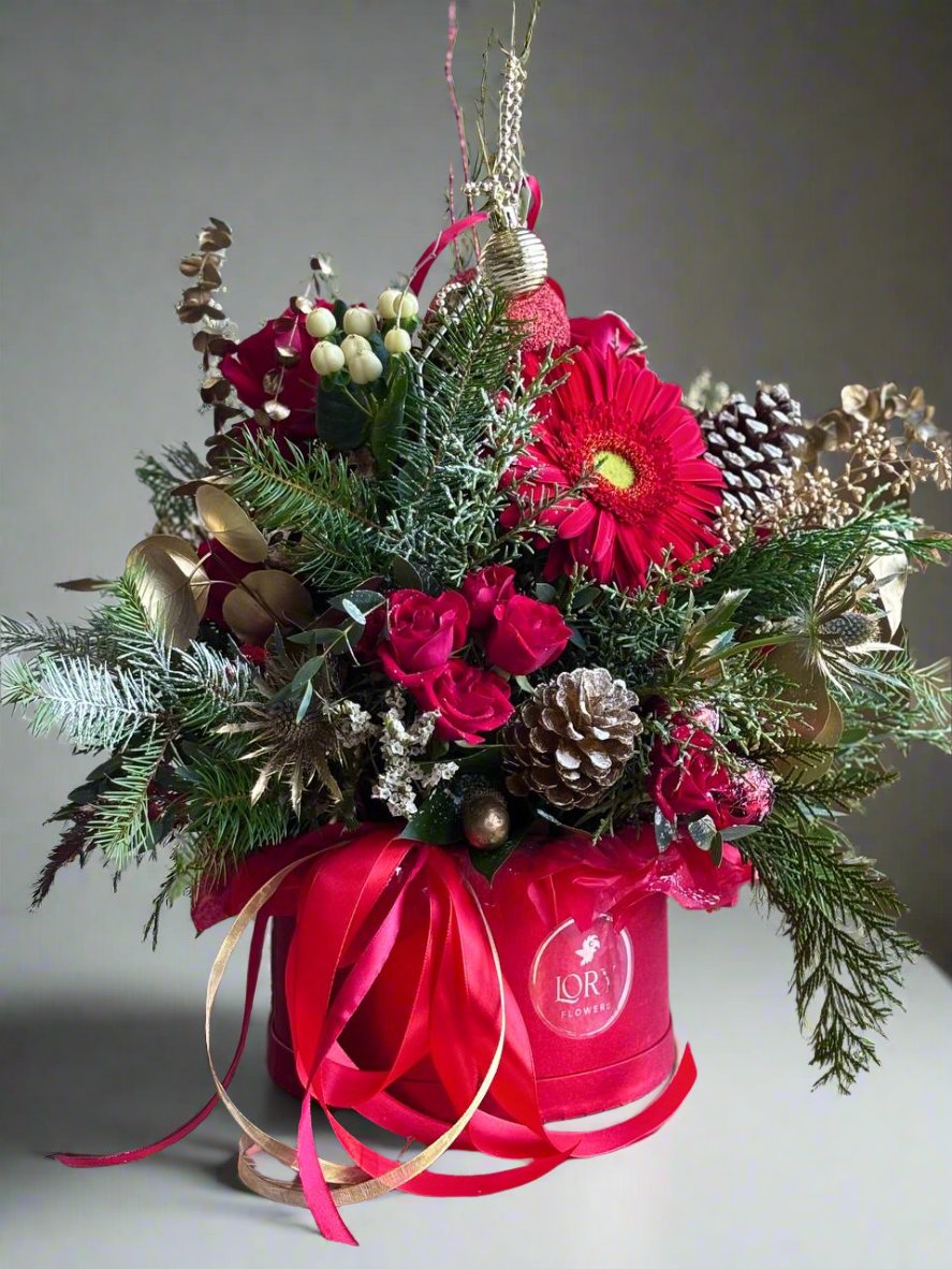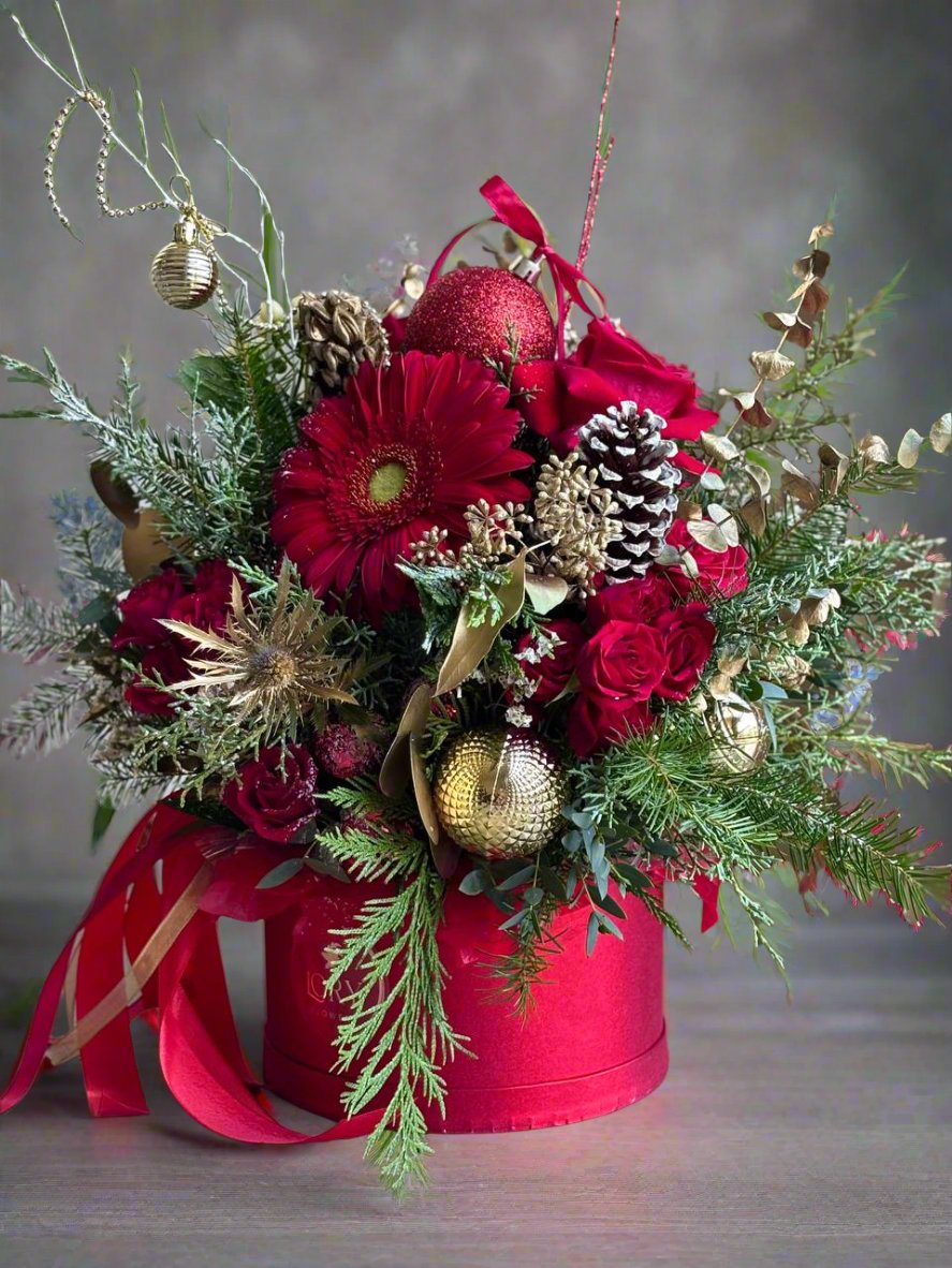 Immerse yourself in holiday magic with our Christmas hatbox arrangement!