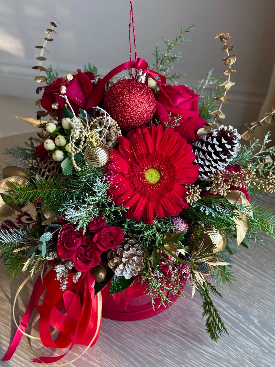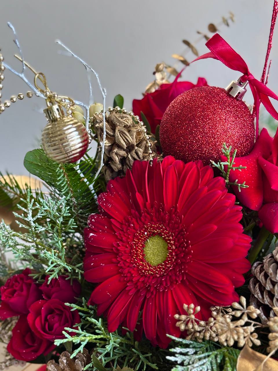 ! The arrangement in the photo features gold decor (Size Gold XL). If you prefer the composition with silver accents, please select the corresponding option.
