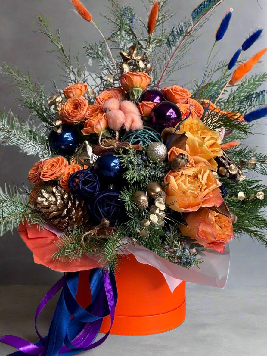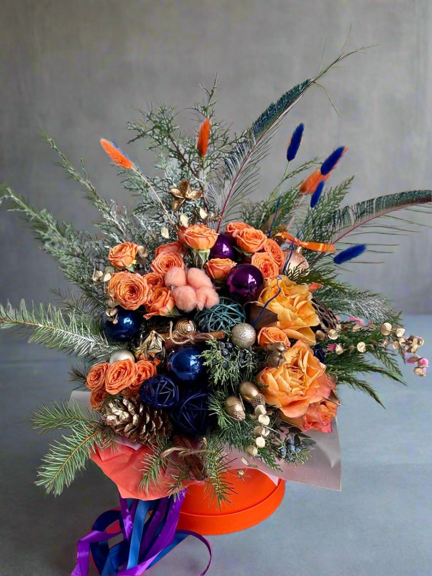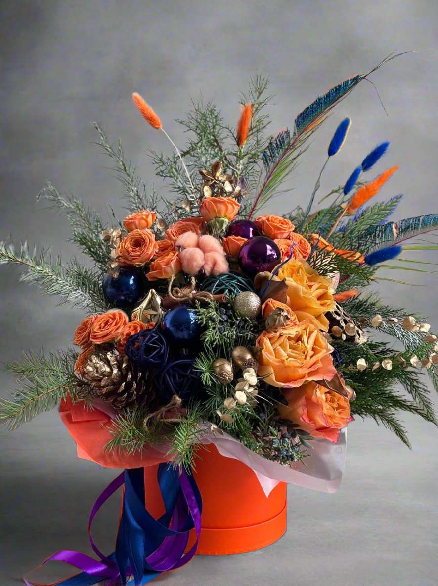 Celebrate the season with the enchanting beauty of our Winter Jewel Tones flower box. This exquisite arrangement features a stunning mix of rich, vibrant hues inspired by precious gemstones—deep blues, elegant purples, radiant oranges, and shimmering gold accents. Nestled amidst festive evergreens and delicate seasonal decor, each bloom brings a touch of sophistication and holiday magic.